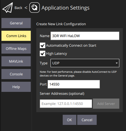 Follow these steps to connect your 3DR Radio 2 WiFi HaLow link to QGroundControl (QGC):